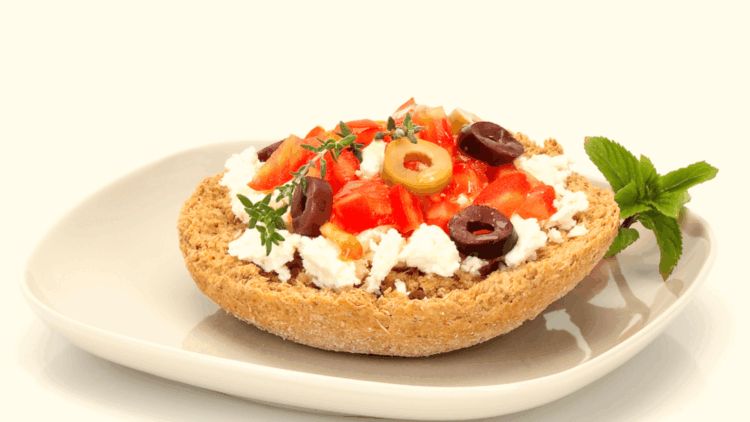 Dakos is one of the most authentic flavors of Crete. It is a simple dish made with barley rusks, fresh tomato, soft cheese such as mizithra or feta, olive oil, and oregano.
